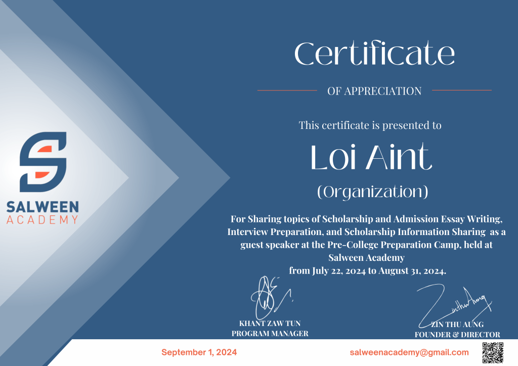 Loi Aint Education Group is honored to have recently participated in Salween Academy’s Pre-College Preparation Camp, where we had the opportunity to engage with students through a presentation on Essay Writing, Interview Preparation for Scholarships and Admissions, and a Scholarship Sharing Session.