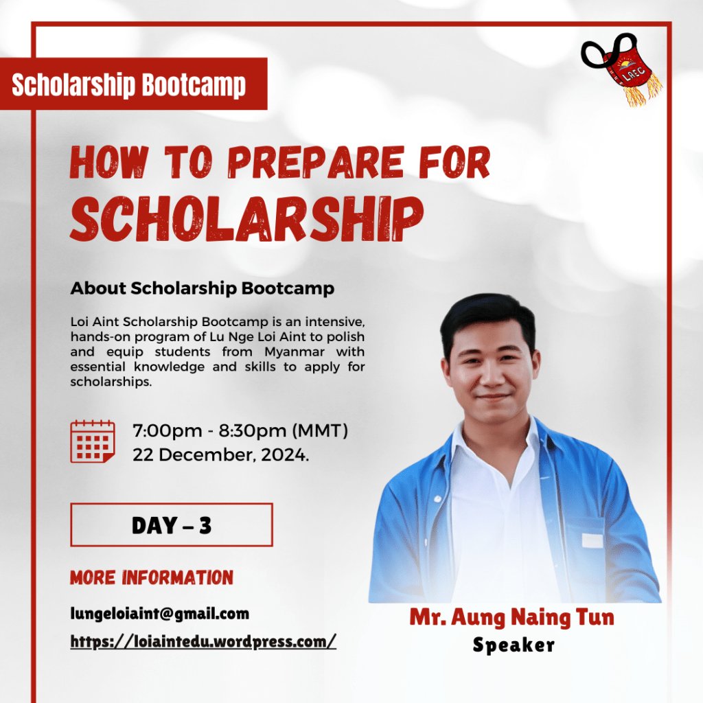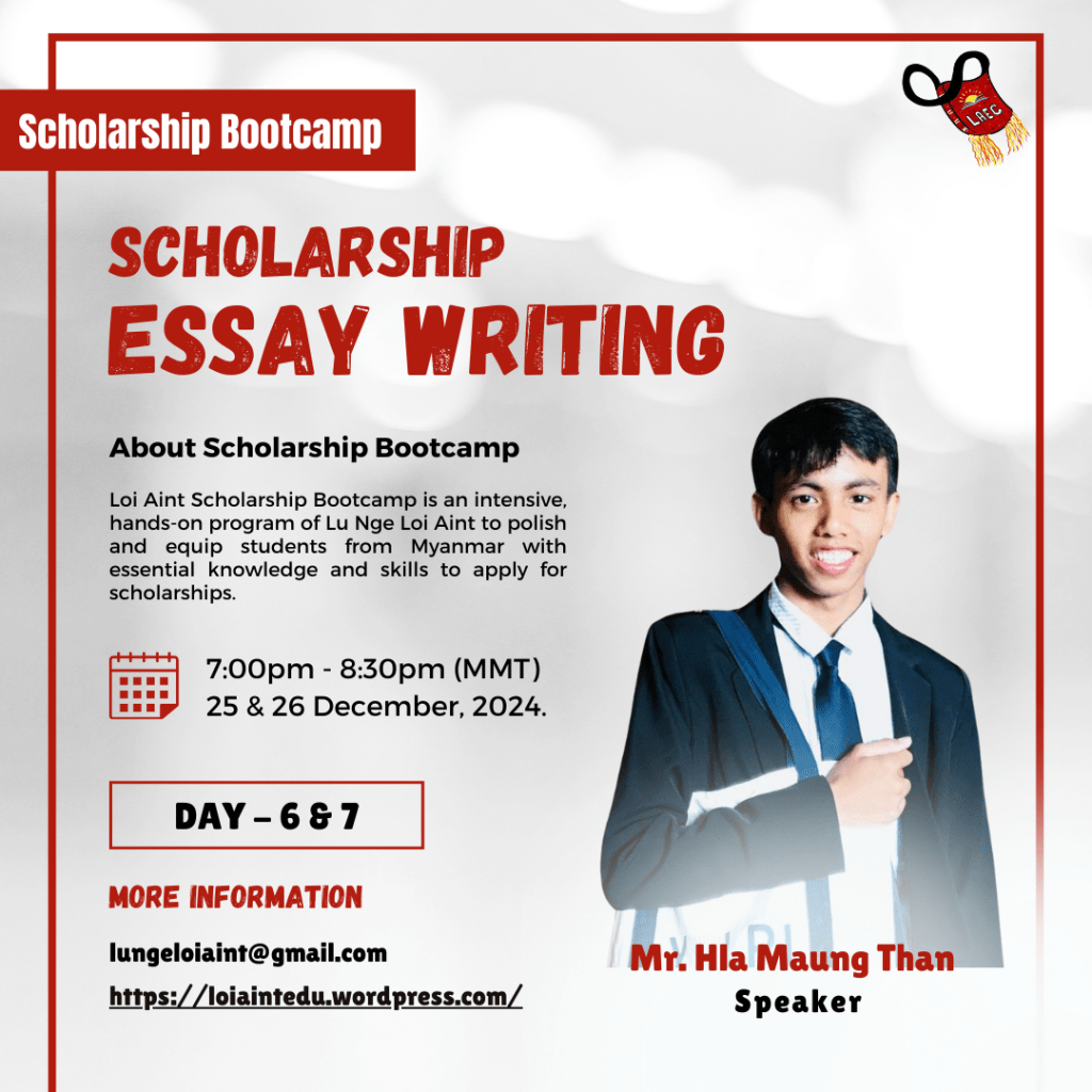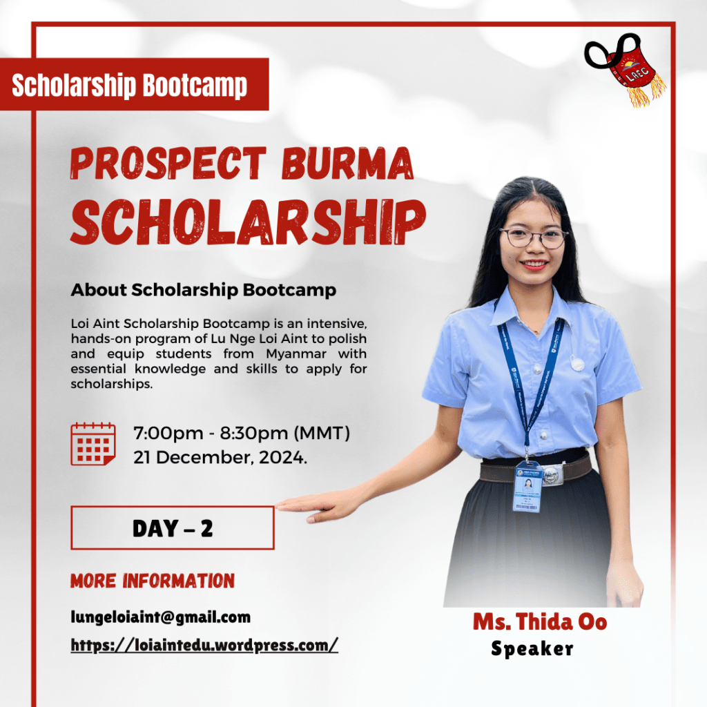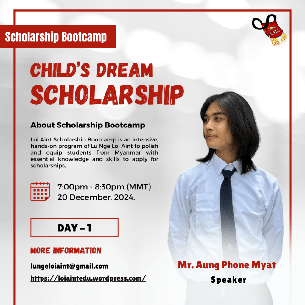 The Loi Aint Scholarship Bootcamp is a comprehensive and practical program developed by Lu Nge Loi Aint, designed to refine and empower students from Myanmar with the requisite knowledge and skills necessary for applying to scholarships, particularly the Child’s Dream and Prospect Burma scholarships.