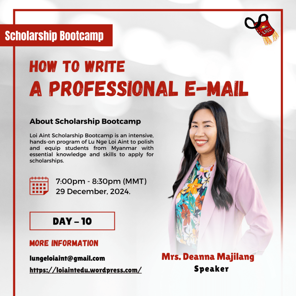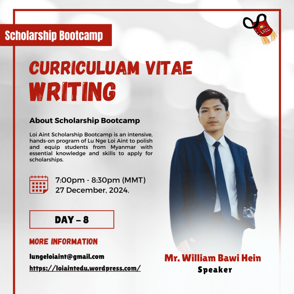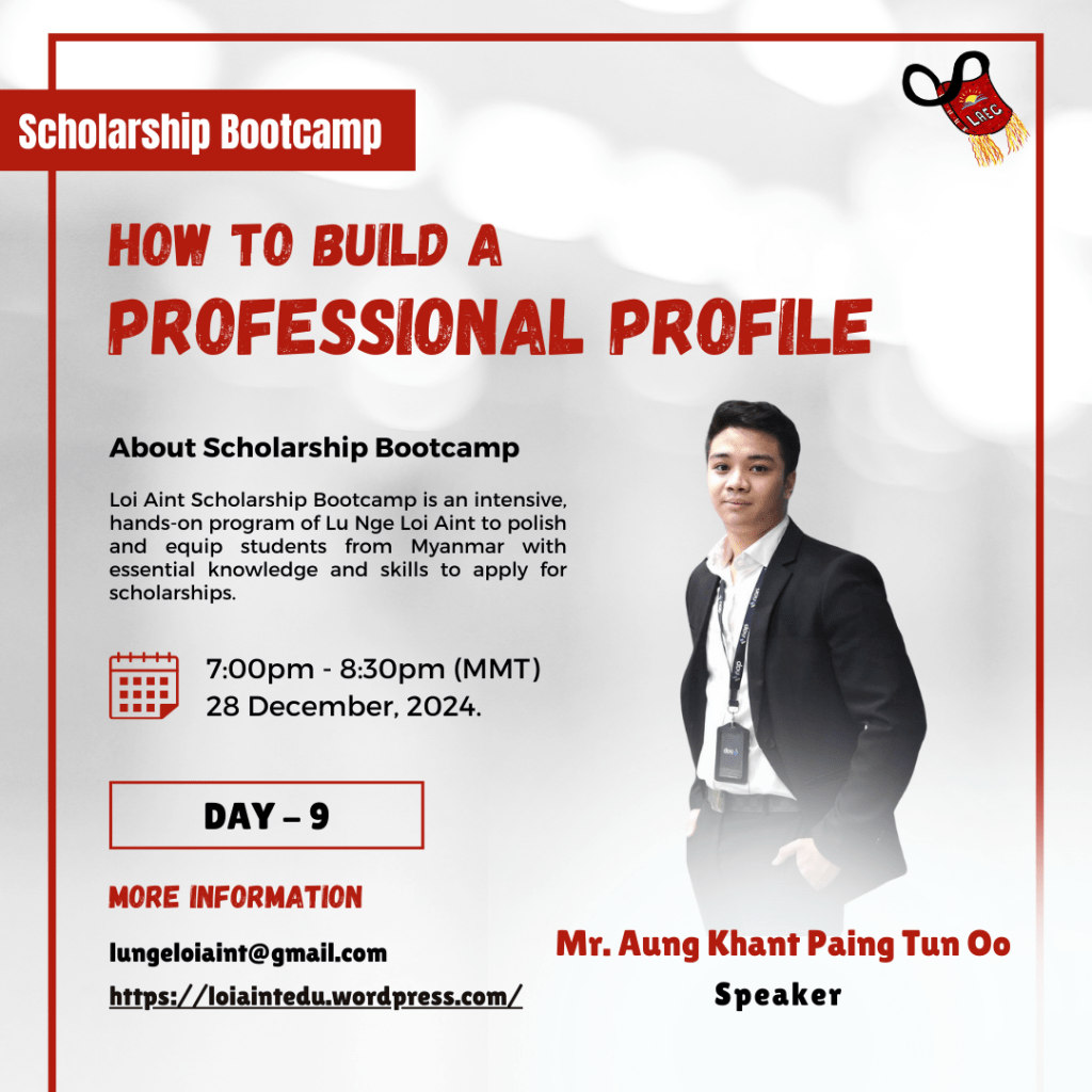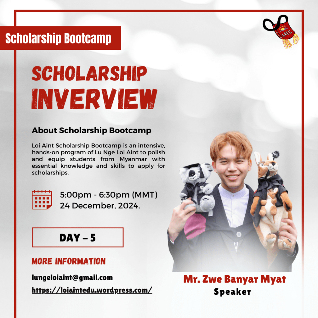 The Loi Aint Scholarship Bootcamp is a comprehensive and practical program developed by Lu Nge Loi Aint, designed to refine and empower students from Myanmar with the requisite knowledge and skills necessary for applying to scholarships, particularly the Child’s Dream and Prospect Burma scholarships.
