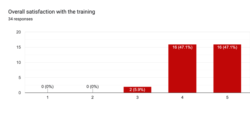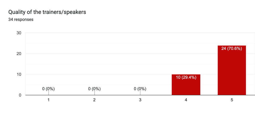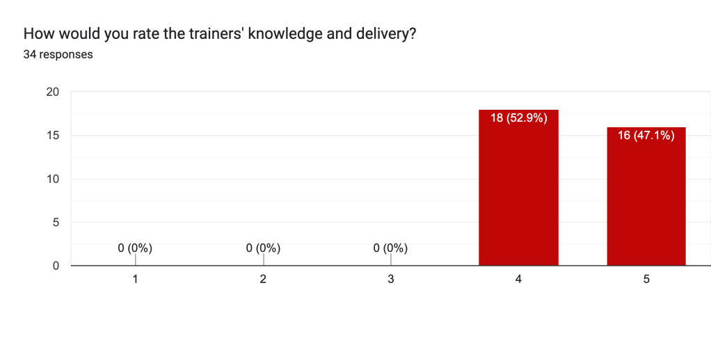 - 100% of participants rated the trainers’ knowledge and delivery at 4 or 5, showing their expertise.
