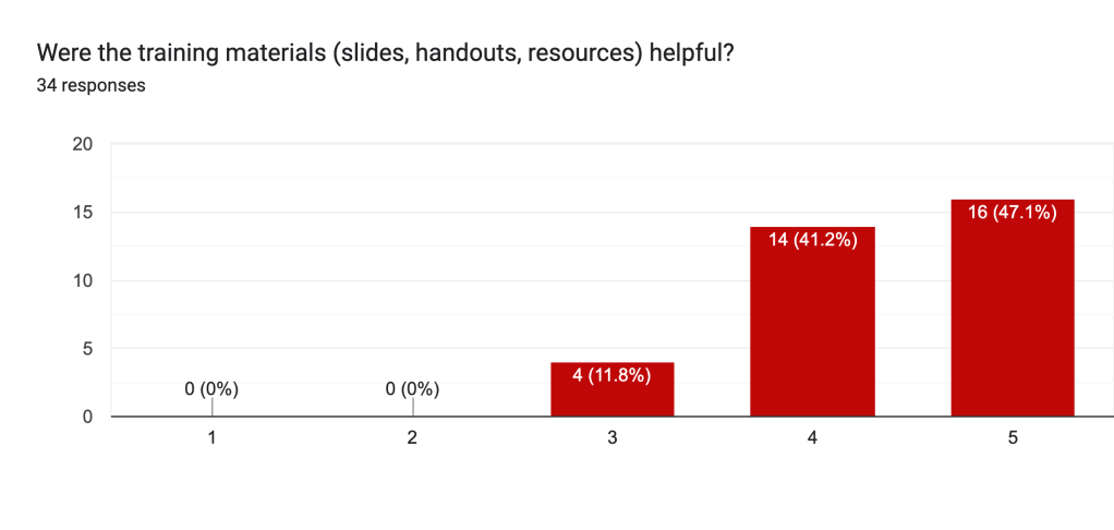 - 88.3% rated the training materials highly (4 or 5), but 11.8% saw room for improvement.