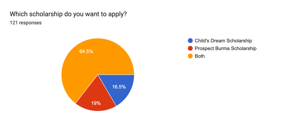 - About 64.5% want to apply for both the Child’s Dream Scholarship and the Prospect Burma Scholarship. This suggests applicants are eager to increase their chances of securing funding, and the bootcamp should offer guidance on tailoring applications for both scholarships.