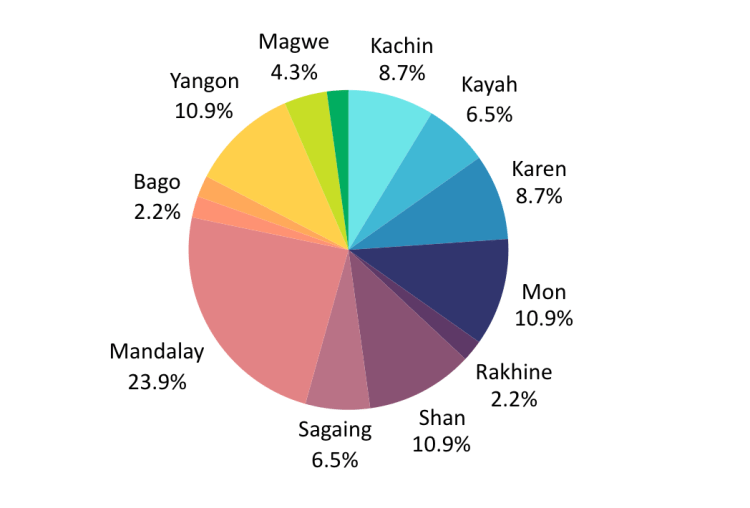 - Yangon (10.9%), Shan (10.9%), and Mon (10.9%) have equal proportions.
